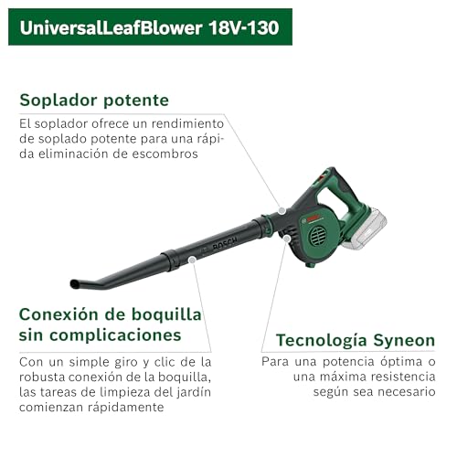 El soplador a batería Bosch UniversalLeafBlower es ideal para limpiar hojas y residuos en jardines. Ligero, con 2 velocidades y diseño ergonómico.
