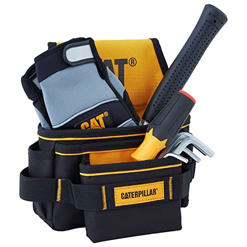 Bolsa organizadora de herramientas Caterpillar GP-65055, fabricada en poliéster y PVC con 5 bolsillos, apertura amplia y soporte para martillo y cinta de medición.