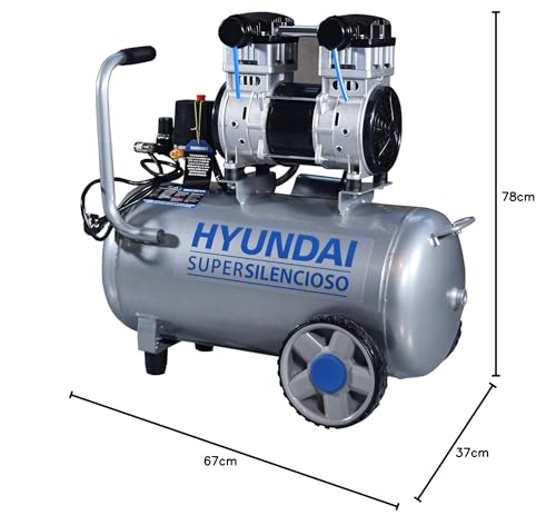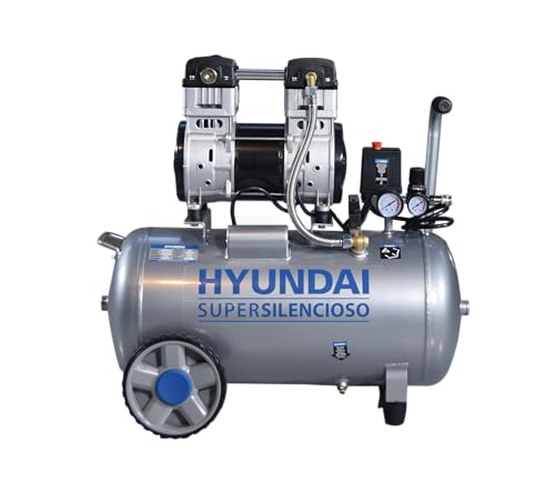 Compresor Hyundai súper silencioso de 50 l, 1,5 kW, ideal para uso en interiores, con diseño portátil y sin mantenimiento.