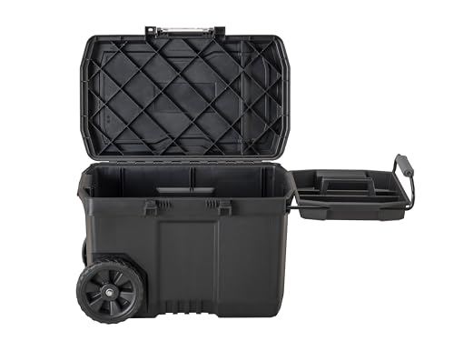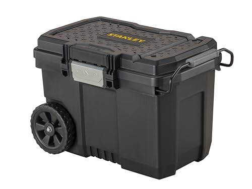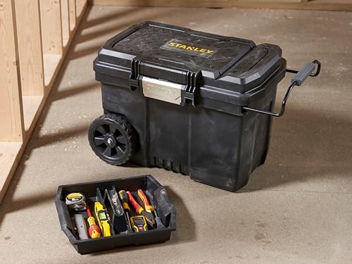 Arcón Stanley de 52L con autocierre, ruedas de 7′, bandeja extraíble, ranura en V, asa telescópica. Protección IP43.