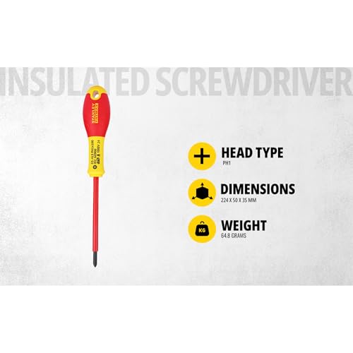 Destornillador Phillips aislado Stanley, ideal para trabajos eléctricos. Ofrece seguridad hasta 1.000V a.c, mango ergonómico y diseño duradero.