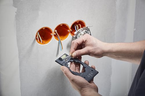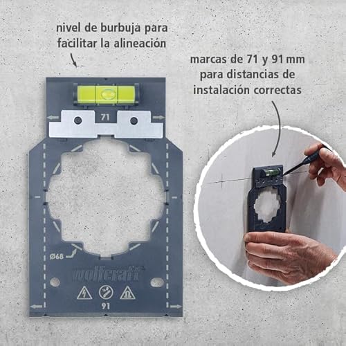La plantilla para marcar y alinear cajas de enchufe Wolfcraft es esencial para instalaciones eléctricas precisas en obra en seco y paredes de ladrillo.