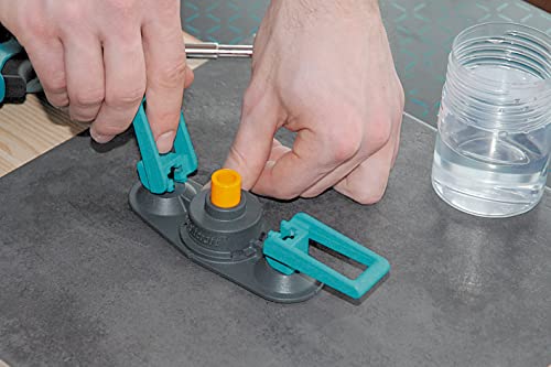 Set de brocas Wolfcraft para porcelánico, incluye 4 brocas diamantadas, guía con ventosas y caja de almacenamiento.